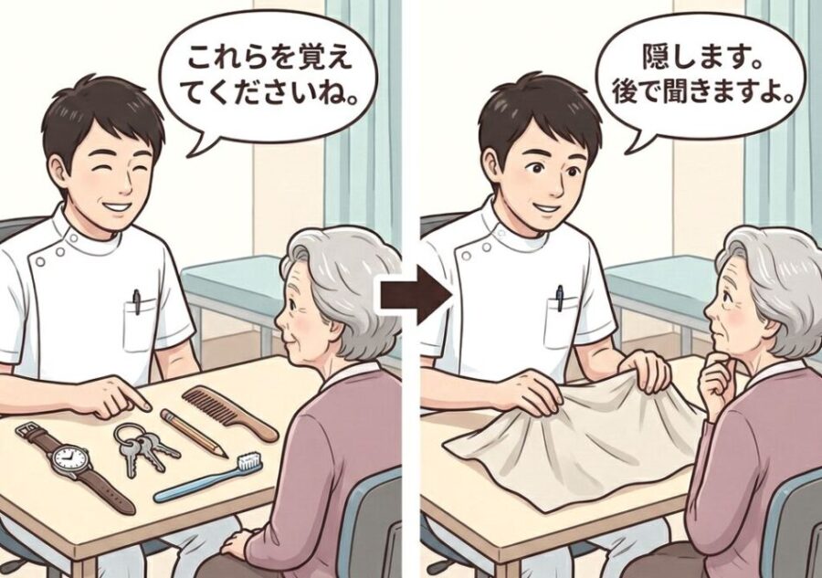 | 物品の記銘・想起/呼称 | 記銘、想起、言語 | 5 | 失点が多いと記憶障害の可能性。呼称が強く落ちる場合は失語も念頭 |