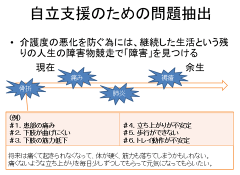 高齢者への運動は軽い負荷で行いがちですが、本人が自覚する運動の強さを確認しながらも、過負荷の原則にあるようにややきついくらいの運動負荷・時間行いましょう。