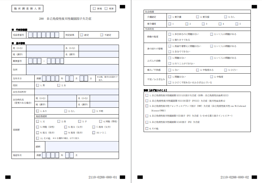 自己免疫性後天性凝固因子欠乏症の臨床調査個人票の例()