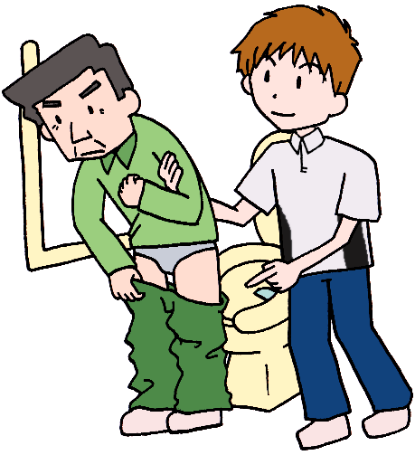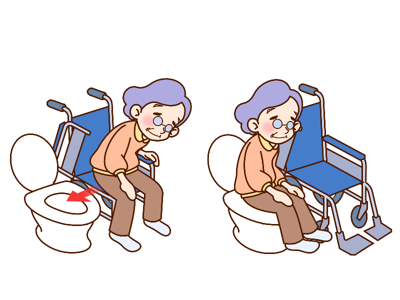 また、どうしても立位が難しい場合は、2人介助でトイレ動作を行うという方法もあります。一人が立位保持を補助し、もう一人がズボン、パンツの上げ下げなどを操作するという場合もあります。