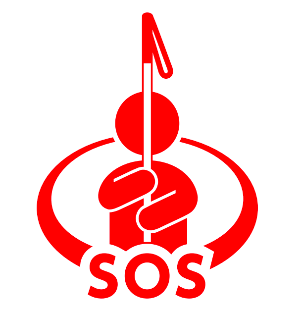 白杖を頭上50cm程度に掲げてSOSのシグナルを示している視覚に障害のある人を見かけたら、進んで声をかけて支援しようという「白杖SOSシグナル」運動の普及啓発シンボルマークです。